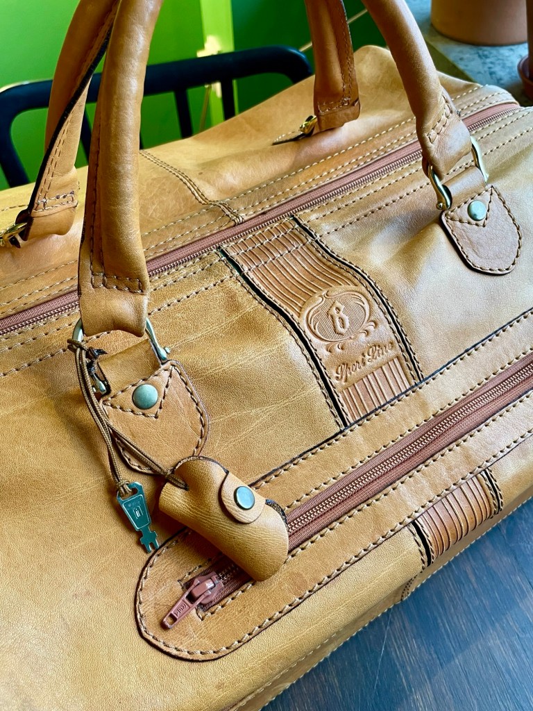 En stadig weekendbag från portugisiska märket Belcinto. Med mölighet att göra huvudfacket större, och dessutom en separat botten för skjortor och annat man vill ha vikt prydligt. Dessutom fanns både lås och nycklar bevarade.
