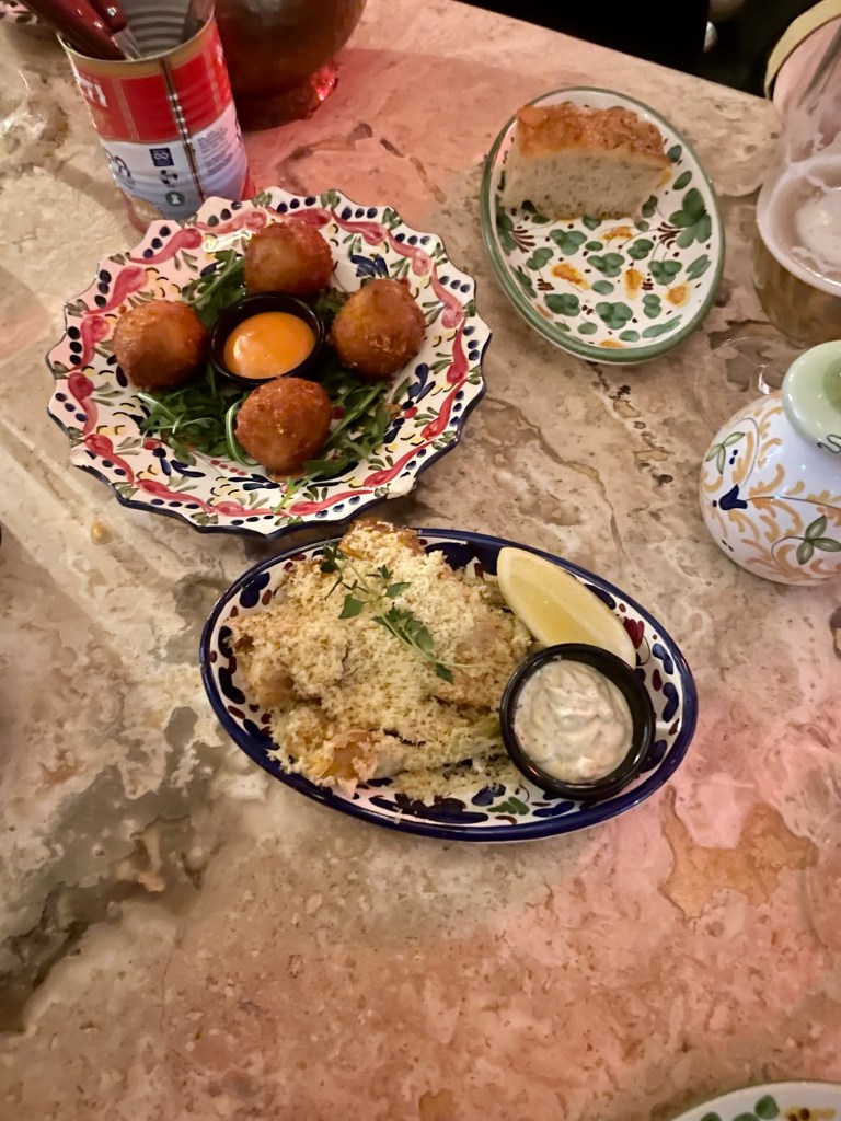 Efter drinken gick vi över torget till vår middagsbokning, Tanya och hennes gäng skulle ha följt med men var för jetlaggade så det blev bara vi och Nika. Inte så bara det heller! Nika har dessutom precis översatt en barnbok för mig också, en bilderbok som kommer ut i april. På Basta kunde en beställa en 3 liter stor flaska öl och dela på, turistigt och toppen tyckte vi och slog till. Vi delade på arancini och friterad kronärtskocka till förrätt, och även här var citronskivan med och briljerade.