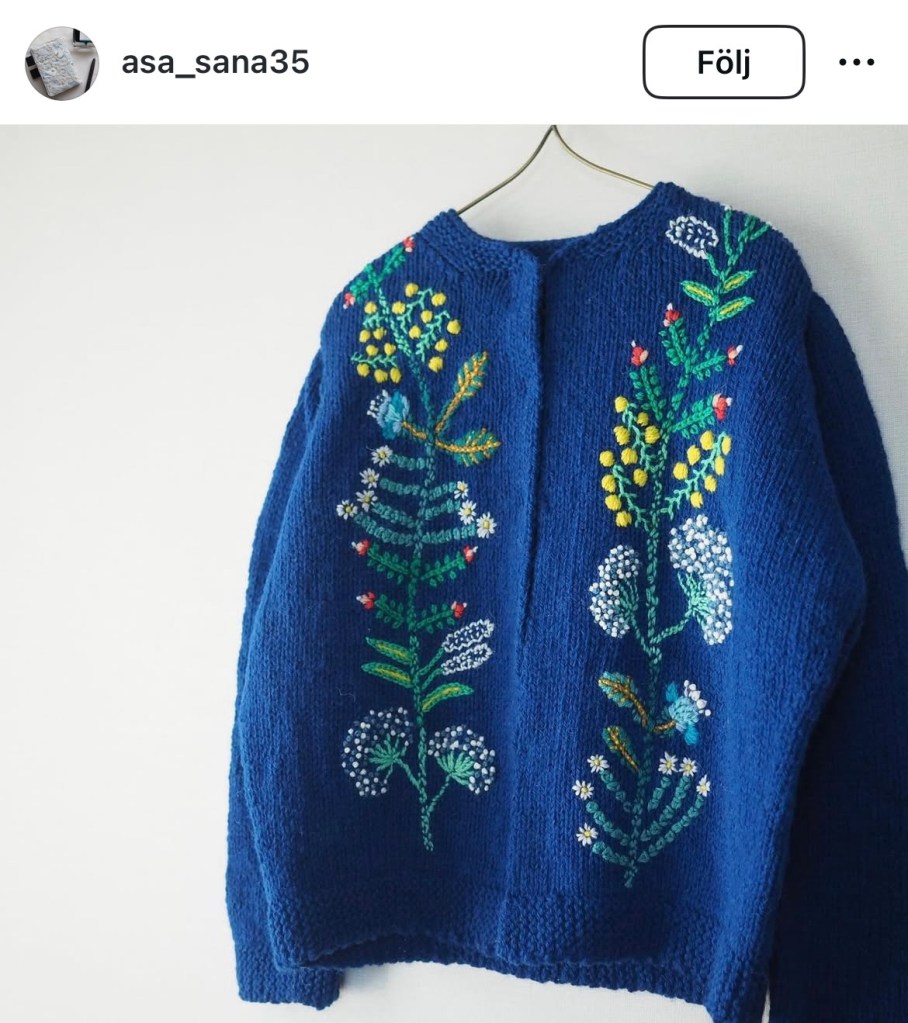 En annan sak jag inte prövat med stickning hittills – brodera ovanpå! Denna kofta väcker absolut ett sug.