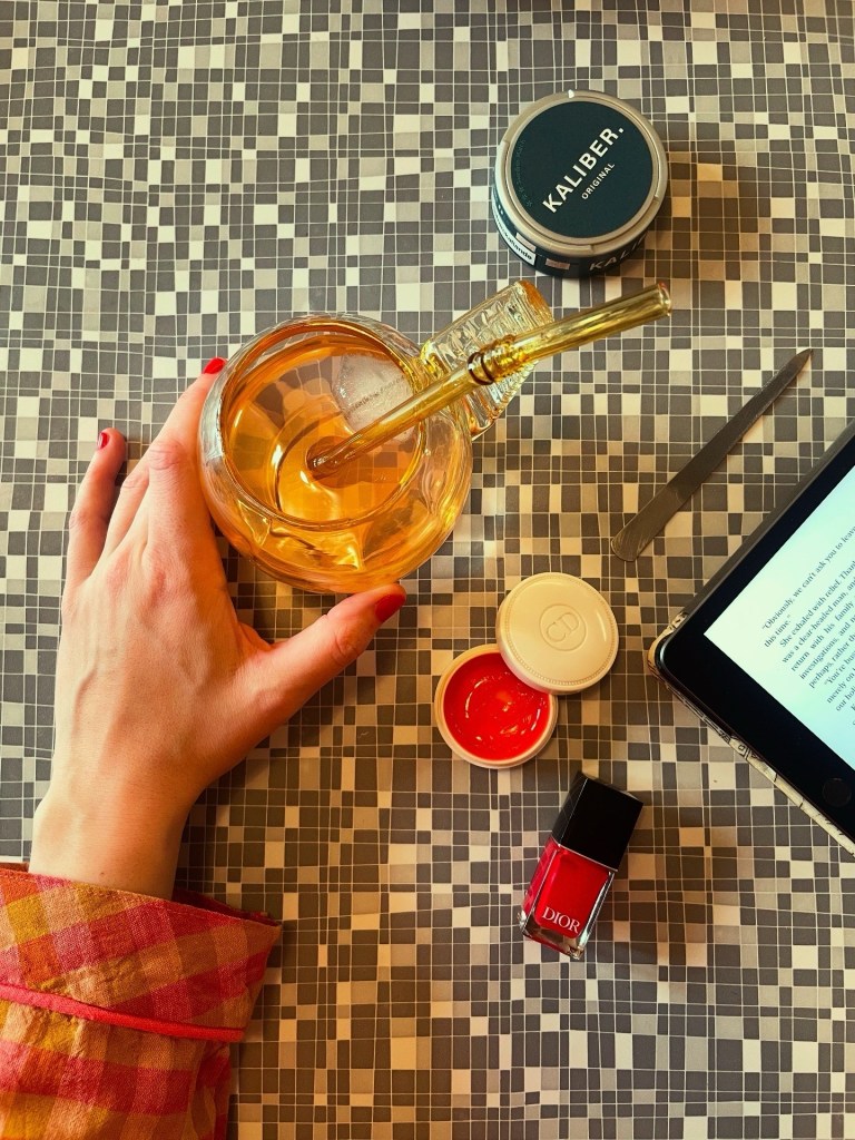 Min besatthet vid Vitamin Wells vatten med rabarbersmak håller i sig, men även svart kaffe, vanligt isvatten eller en blodapelsinläsk går bra. På krogen blir det enbart stora stark.
