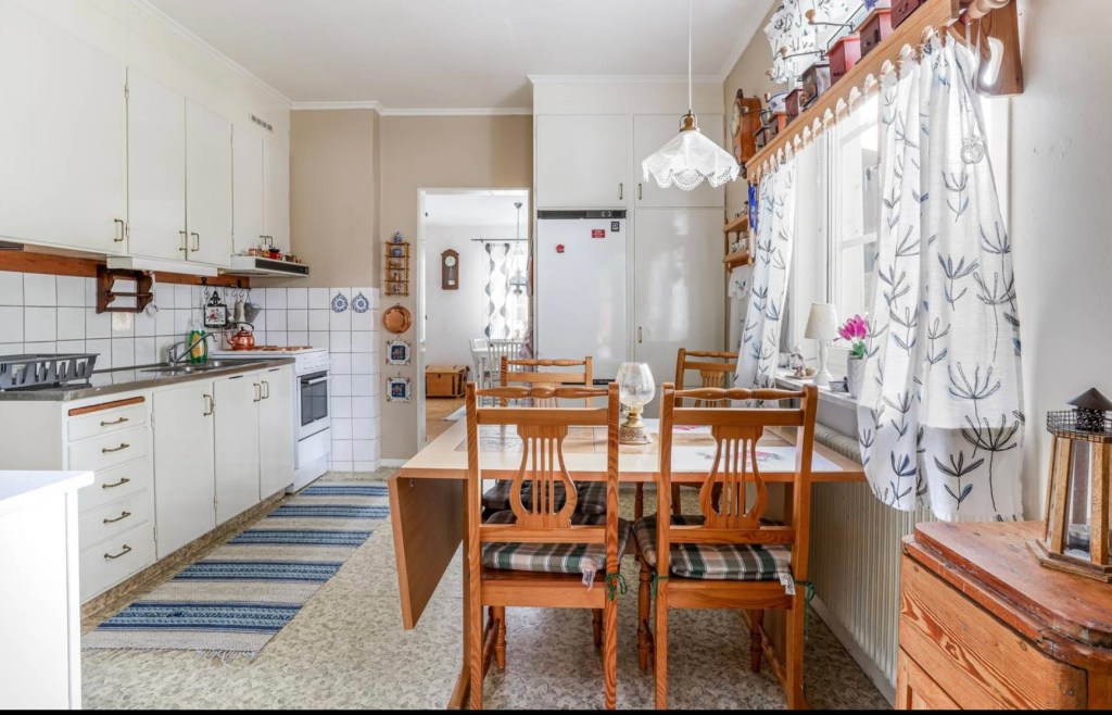 Köket är stort, enligt mina hembyggda ritningar utifrån fotografier ungefär 3,4×2,5m.