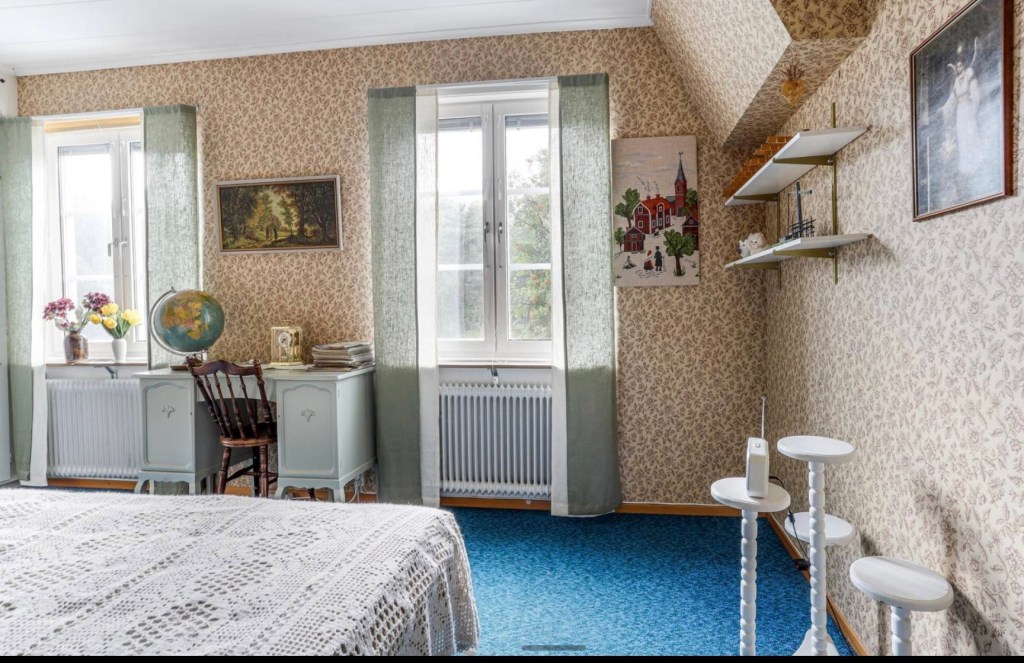 Sovrummet är stort och har två fönster mot älven. Hit har jag köp nio rullar tapet och hoppas innerligt det räcker!