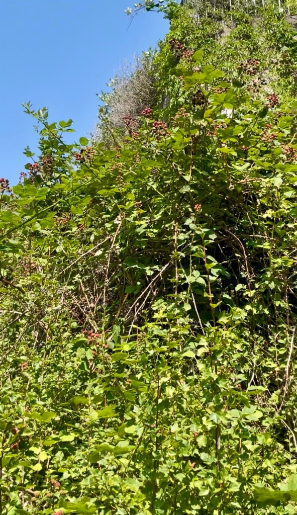 Sedan var det fredag och strålande sol! Jag gjorde ärenden i Sickla och tog cykeln förbi björnbärsbuskarna. Det ser ut att kunna bli ett överflöd i år, men inget var moget ännu.
