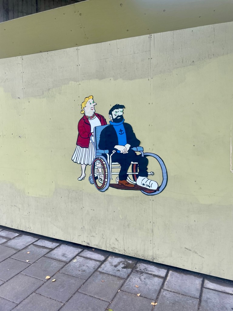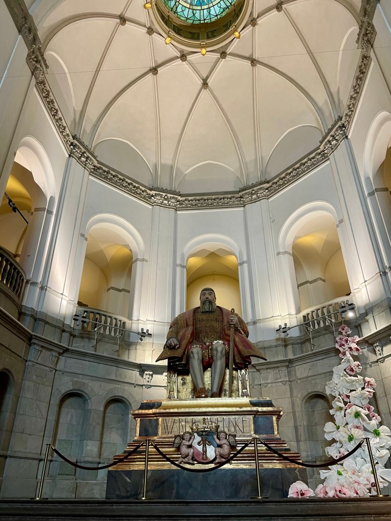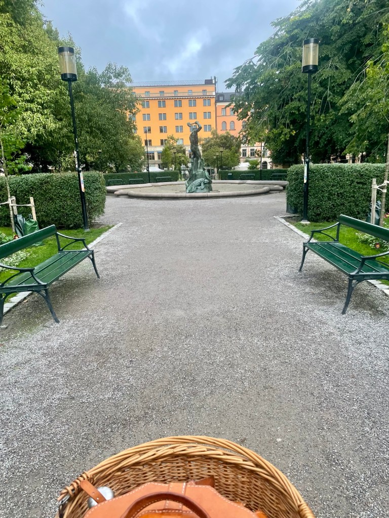 Genom Mariatorgets promenadstråk med statyer och fontäner.