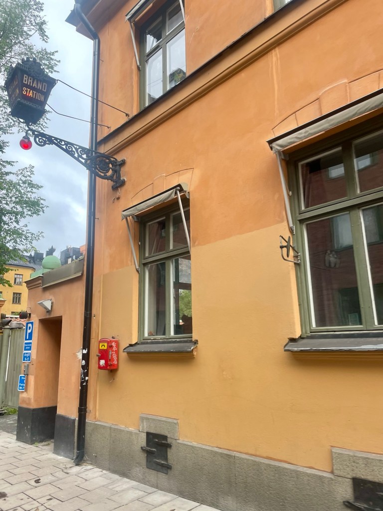 För att göra secondhandrundan komplett cyklade jag till Stadsmissionen vid Nytorget, men där fanns ingenting jag ville ha. Dock finns det ett falurött plank i närheten, så jag passade på att fota mina nysydda jeans som jag hade på mig.