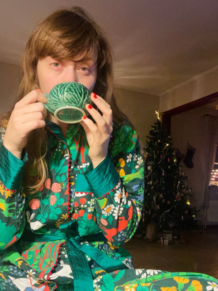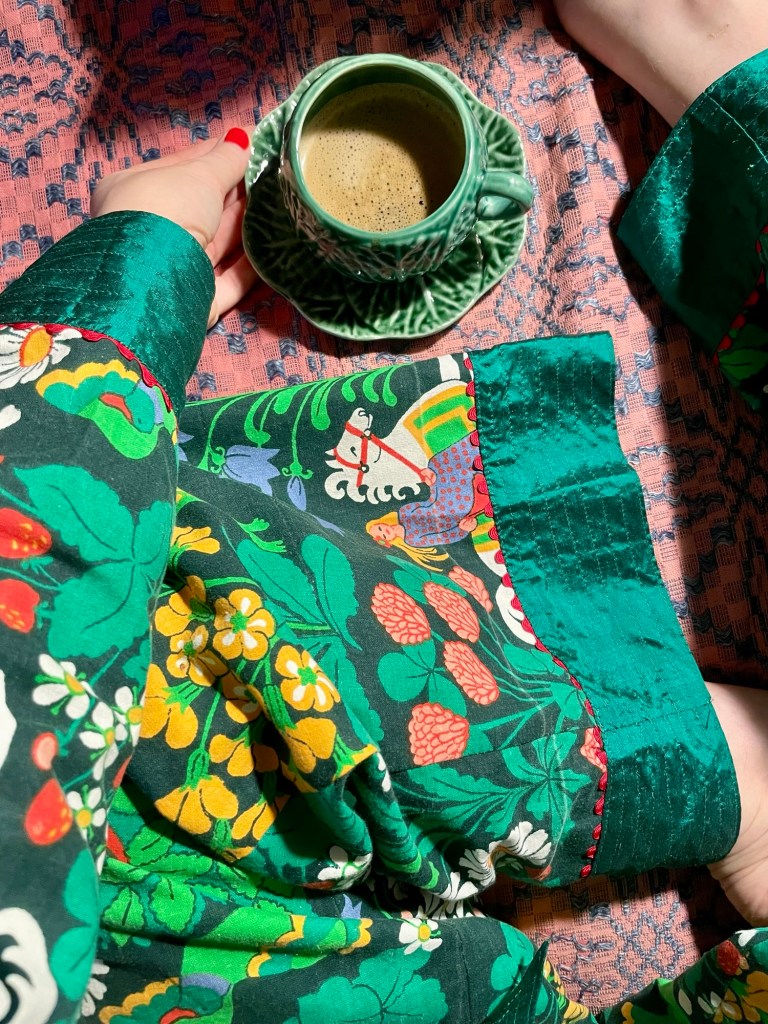 Julpyjamasen som jag sydde i januari är på, och kaffet dricks ur portugisisk kålkopp. Ute är det alldeles mörkt och tyst. Fredde sover fortfarande.