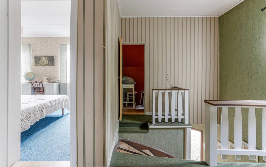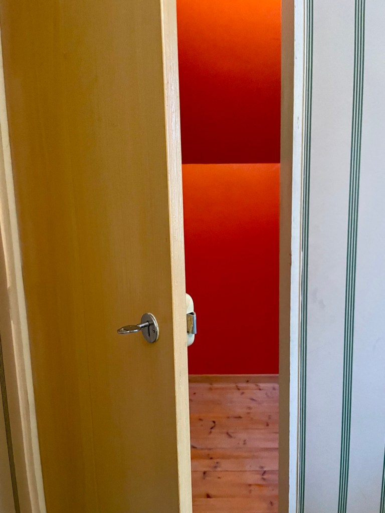 När vi köpte huset skymtade det här spännande rummet förbi bland mäklarbilderna. Ett litet rött rum med snedvägg och balkong över trappen. Gulligt.