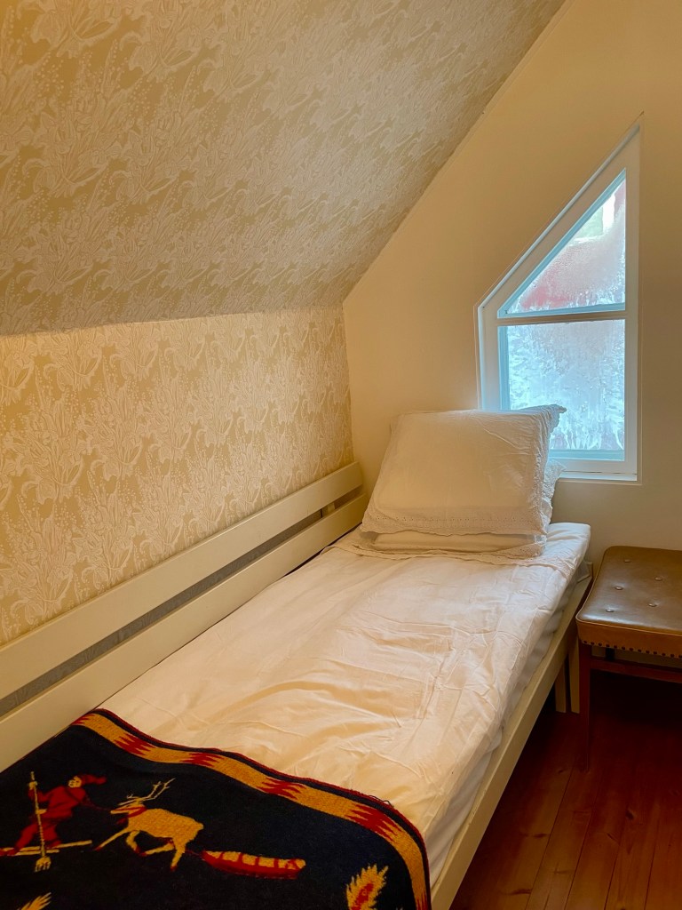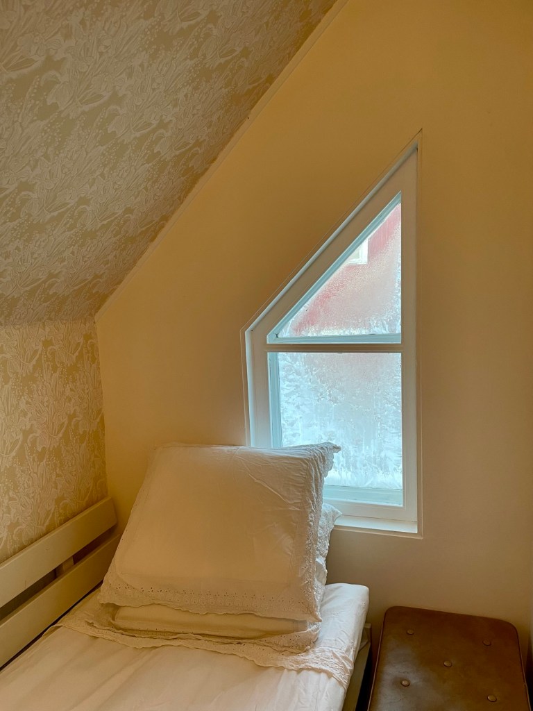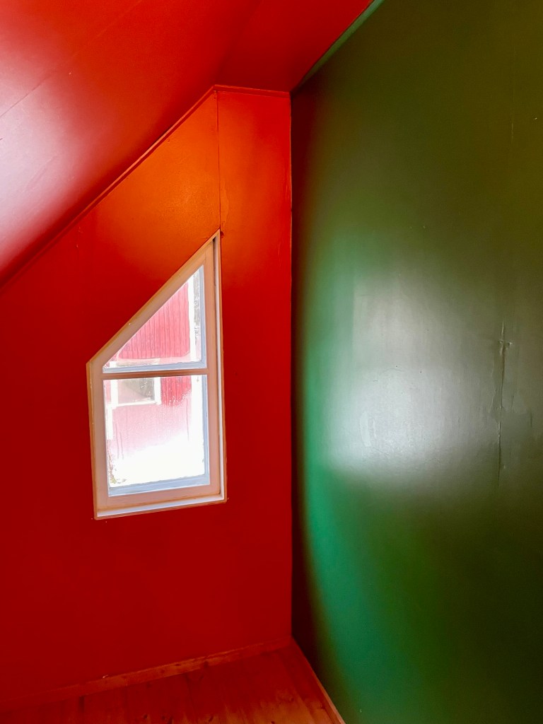 Det visade sig vara en liten kattvind med sött fönster och masonitklädda väggar målade i grälla färger. Jag älskar rött, och jag älskar grönt, men just så här nära varandra blev det lite väl juligt. Jag ville göra om det till ett gästrum och vi skulle få gäster över nyår så det kändes som ett överkomligt projekt.