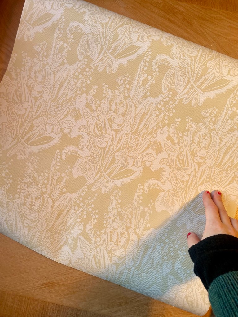 Bland min samling tapeter hittade jag två rullar av dessa. Mönstret var vitt så det skulle ju matcha med det nymålade. Jag köpte dem på Sellpy i somras för 70kr för bägge. Det är gamla Eco, från 70/80tal någon gång skulle jag tro.