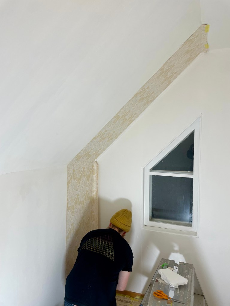 Jag målade fönster, foder, hörn och kanter och Fredde rollade loss, jag är tydligen väldigt snål med färg när jag målar så han gör det bättre. Sedan började vi tapetsera.