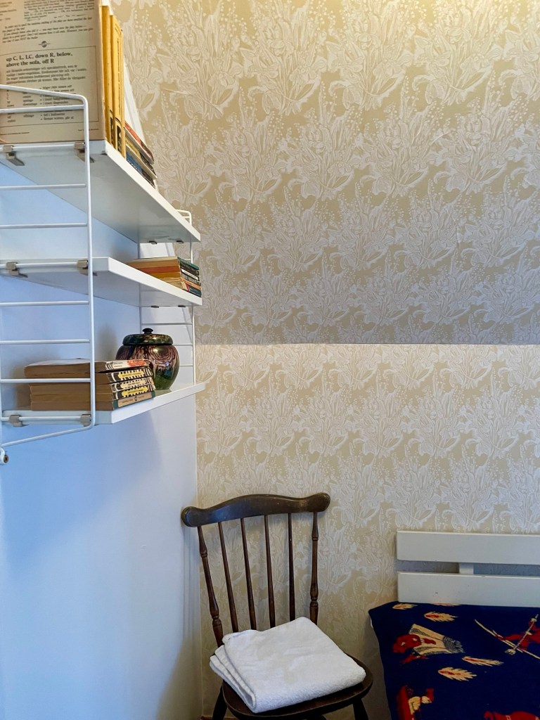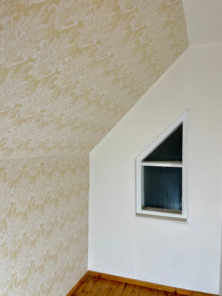 Det var ett gissel. Inte en vinkel är rät, inte ens de som ska vara det. Och masoniten bucklar och skarvarna fick tapeterna att bubbla. Men i måndags efter middagen blev det klart!