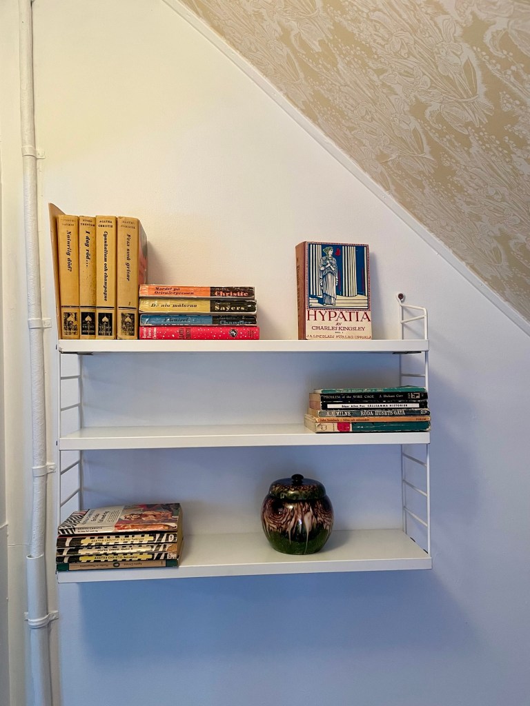 En Stringhylla modell pocket, som jag fick för minst tio år sedan, skruvades upp och jag fyllde den med deckare och äventyrsböcker, sådant jag tänker mig att en gäst som har svårt att somna vill läsa.