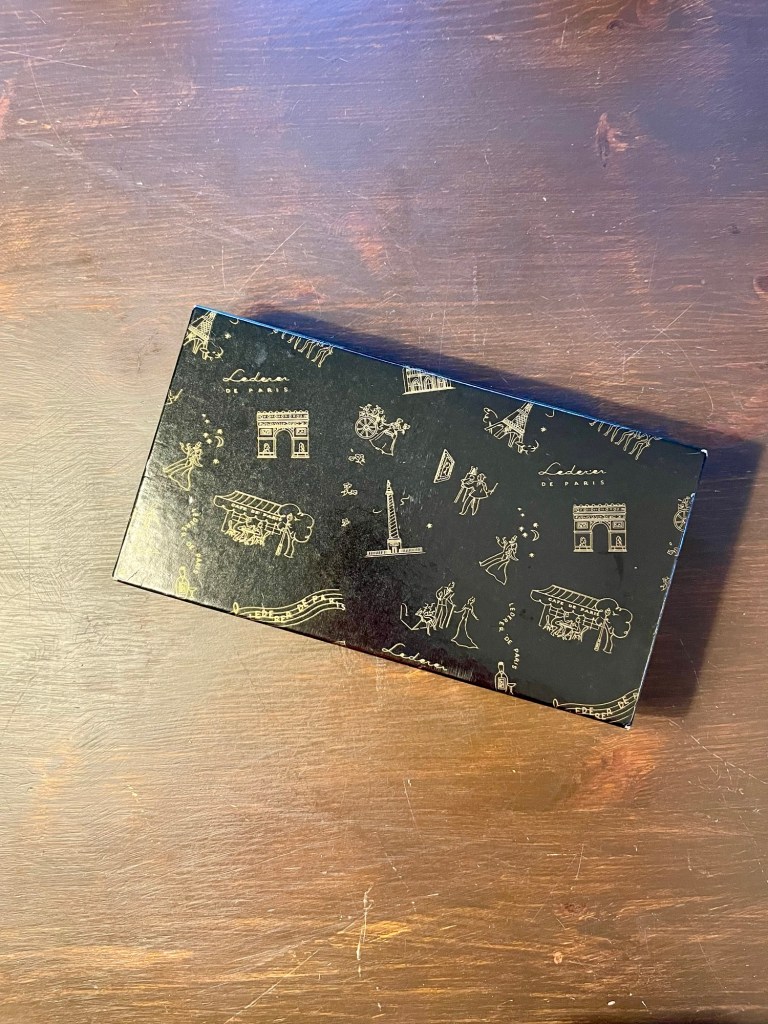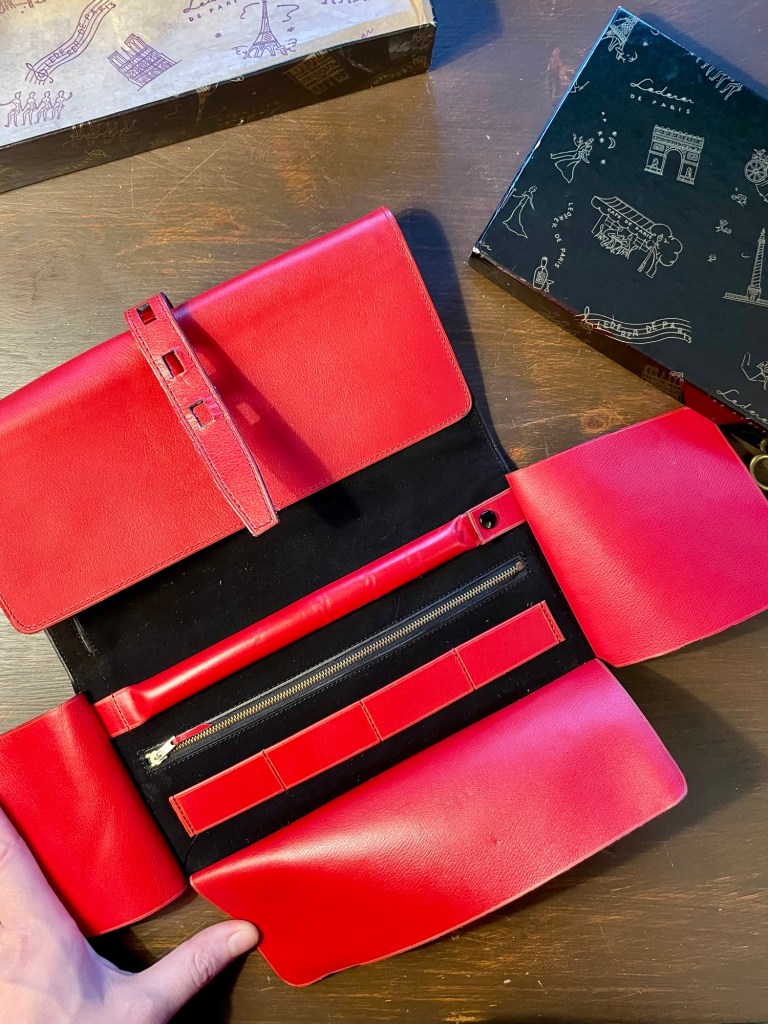 Det är ett resesmyckeskrin från Lederer de Paris. Företaget grundades på 1800talet och gick under tidigt 2000tal då de hade roat sig med att göra Hermes-kopior. Denna pjäs tycks som sagt vara från 60talet, och oanvänd.