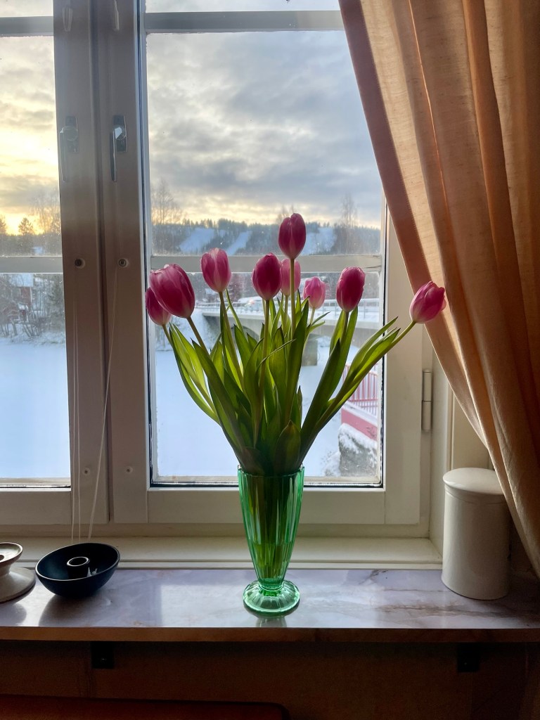 Sedan ställde jag närodlade tulpaner som vi fått av Karro och Olle i fönstret.