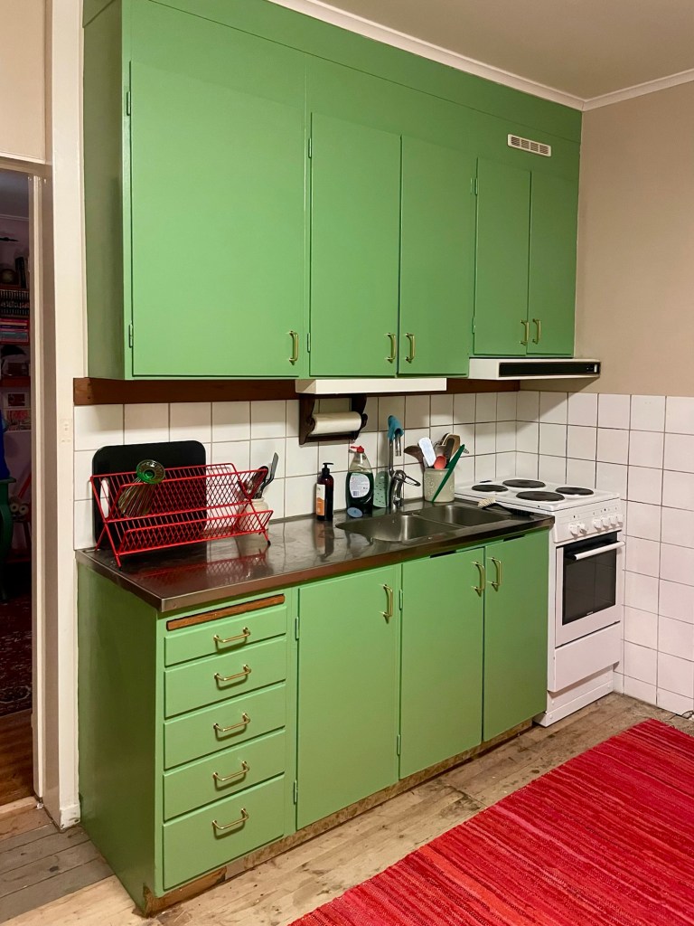Och så kom avfärdsdagen. Det var 25 minus och bilen ville inte starta förrän den fått stå med motor- och kupévärmare i ett par timmar, men sedan kunde vi lämna det grönmålade köket i vinteride.