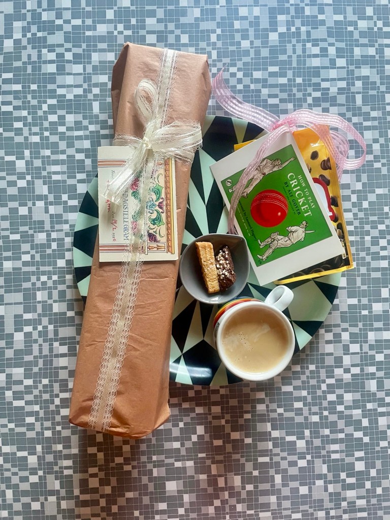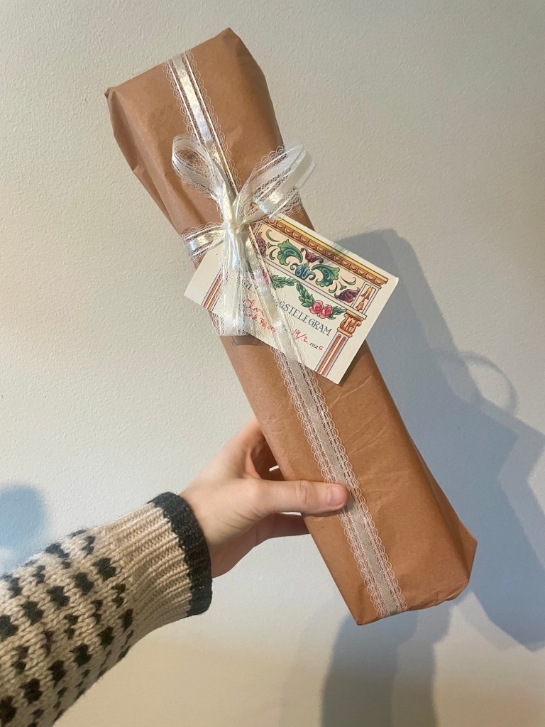 Efter väl utfört uppdrag hade jag paketinslagning på dagordningen, eftersom jag hade hämtat Freddes födelsedagspresent på posten. Snitsade till paketet med gammalt snyggsnöre och ett telegram.