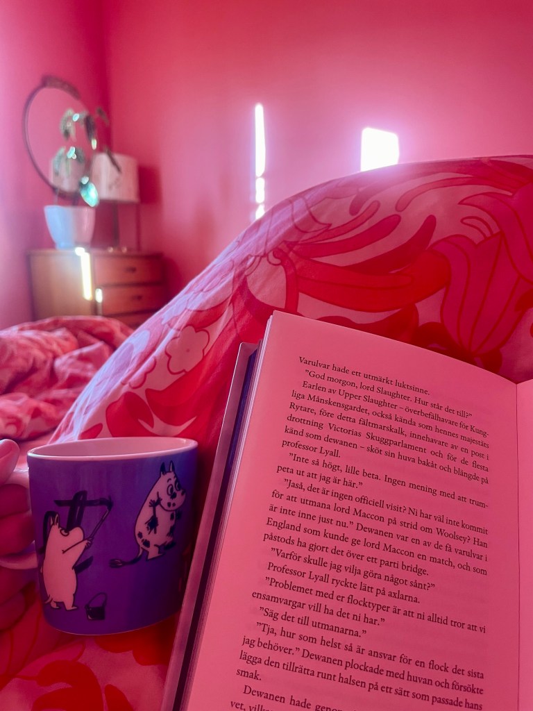 Och igår lyste solen för fullt, ute var det kallt och krispigt och inne låg jag och var sjuk. Hela dagen. Jag fick kaffe i sängen och läste bok. Jag har projekt hyllvärmare i år och läser om The Parasol Protectorate-serien av Gail Carriger. Tre av böckerna gavs ut på svenska för sisådär 15 år sedan och de läste jag. Sedan köpte jag glatt de två sista delarna på engelska, men läste aldrig. Igår läste jag klart tredje delen och nu ska äntligen fyran bli läst. Det är Victorianska eran, varulvar, vampyrer och lite steampunk. Perfekt sjukstugeläsning med andra ord.