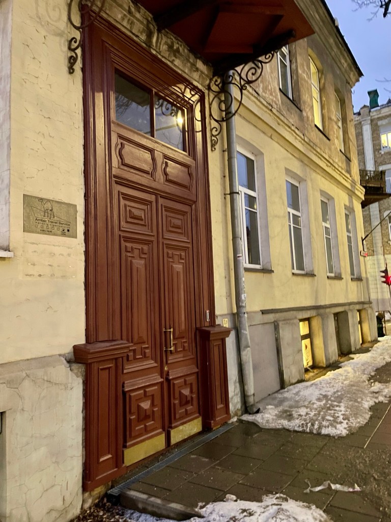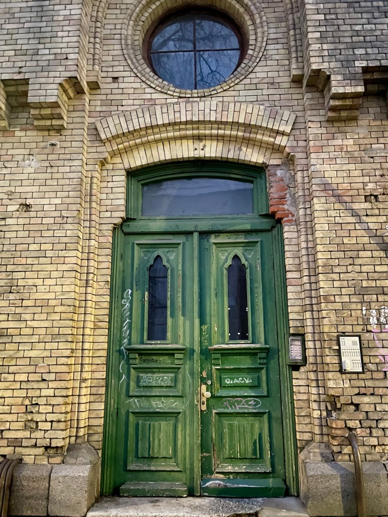 Jag haltade mig genom Vilnius, för jag har ett knackit knä som bråkar då och då – och alla bibliotekstrappor och blött, kallt väder gjorde inte susen, så jag fotade snygga portar. Som denna.