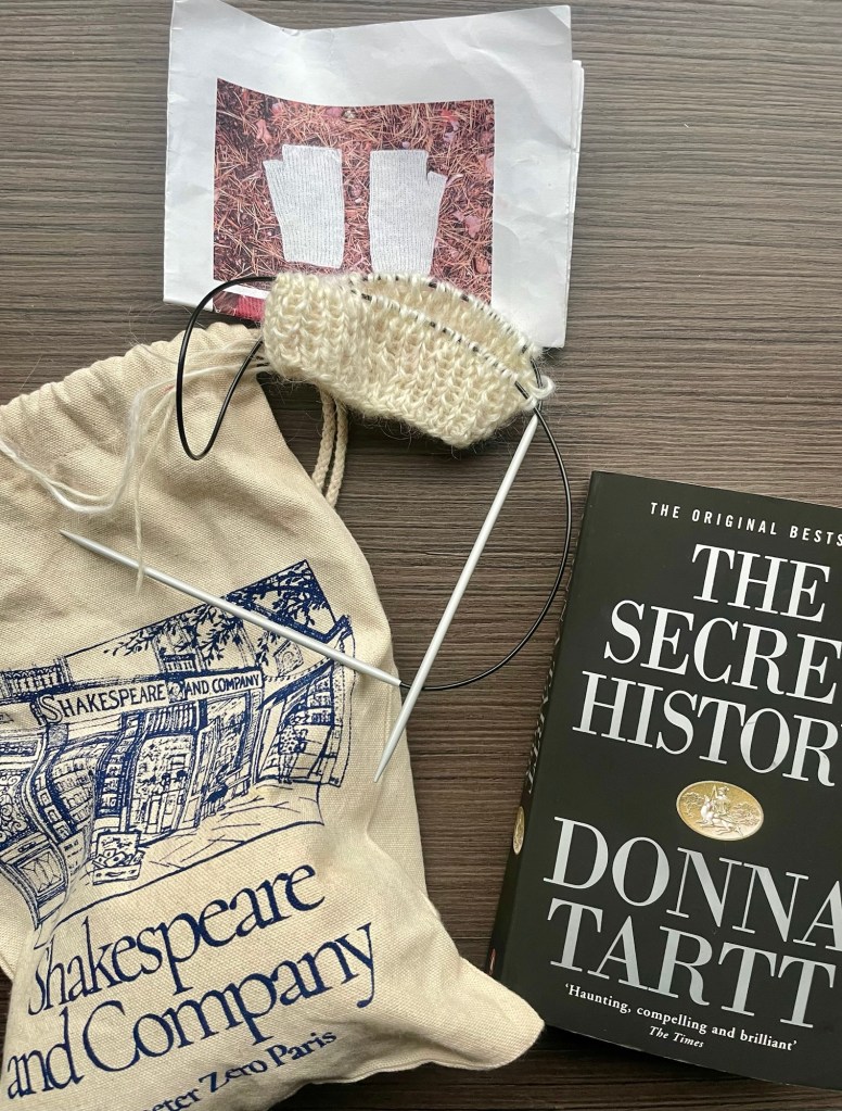 På Littfest är det ganska många lugna perioder vid bokbordet, när alla besökare är på samtal, så jag har med min stickning och nuvarande läsning.
