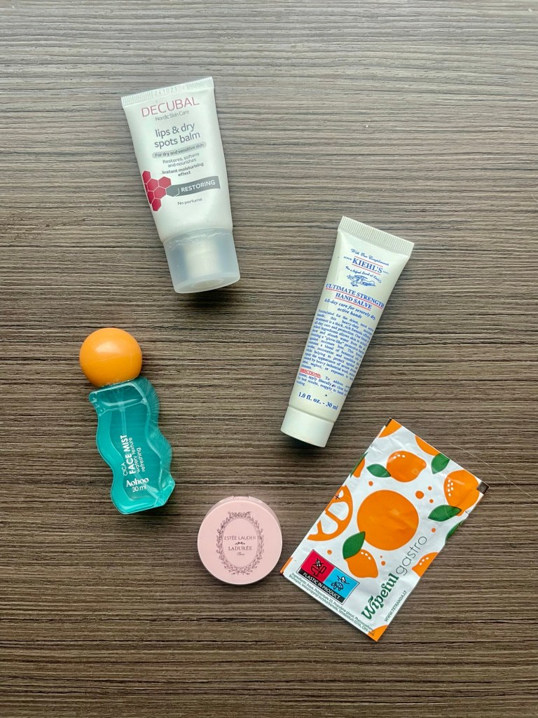 Sist men inte minst – smörj. Det är alltid torrt på mässor, så jag har bunkrat med lypsyl, facemist och handkräm. En våtservett är aldrig dumt, så jag tar alltid extra när det finns på restaurang och sparar till sådana här tillfällen. Och så sist av allt, ett litet färgat läpp- och kindbalm med spegel i burken, så en kan piffa till sig under dagen.