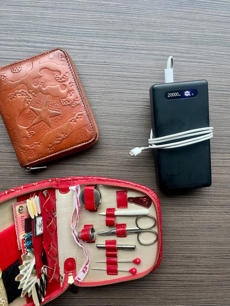På nödvändighetsfronten har jag plånbok, bärbar laddare och ett sykit, främst för att kunna markera i stickningen.