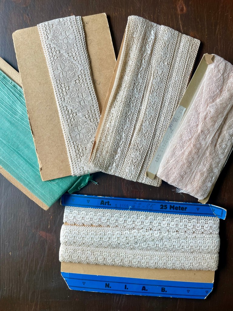 På Vinted hittade jag en hel låda sybehör och pynt, tillexempel alla dessa goa spetsar. Förmodligen behöver de användas till att dekorera underlinne och kortbyxor.