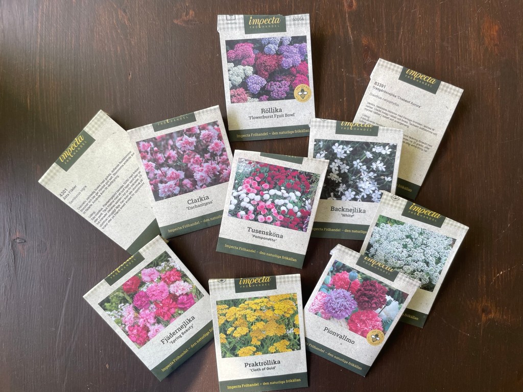 För några veckor sedan beställde jag blomsterfrön. Planen är att anlägga en blomsterrabatt på terassen, där det tidigare också varit en. Jag bestämde mig för vita och rosa blommor, främst perenner, och i varierande höjd. Den gula rölikan kunde jag inte låta bli, men den får nog bo någon annan stans i trädgården.