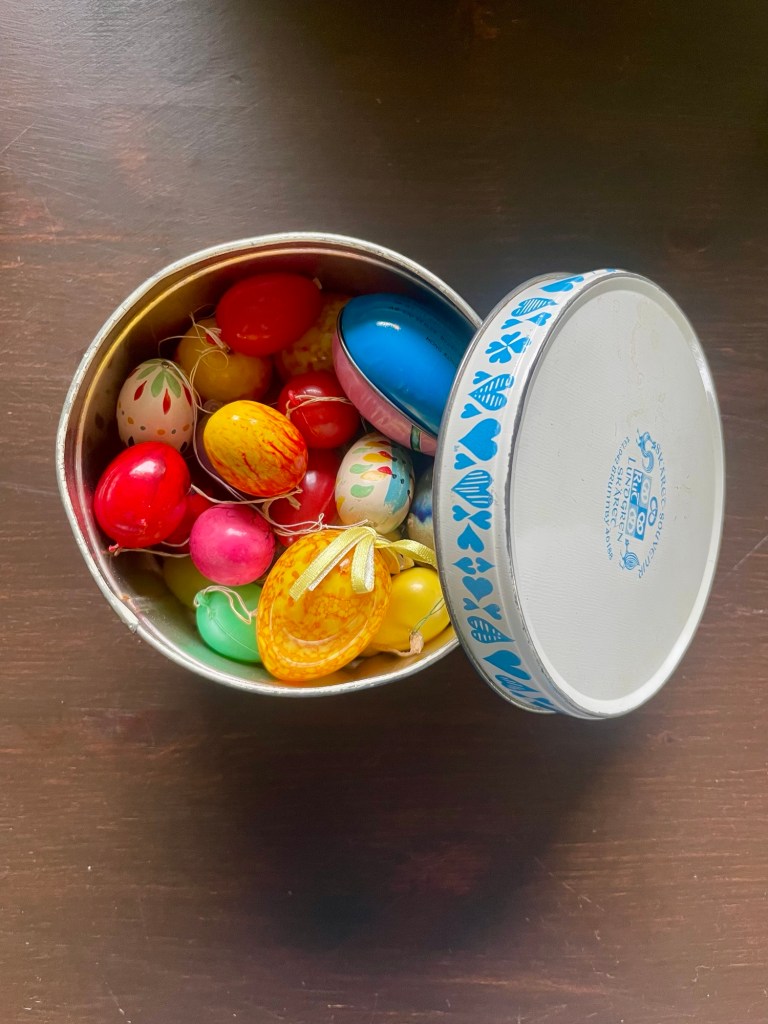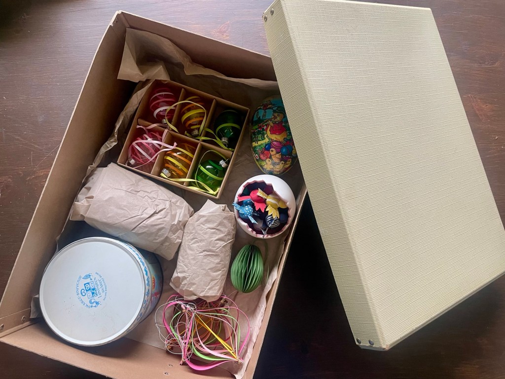Först och främst, det finns verkligen en specifik påskpyntlåda i detta hushåll. En för varje högtid. Påsk, jul och kräftskiva är de högtider som firas nog här hemma för att få en egen låda.