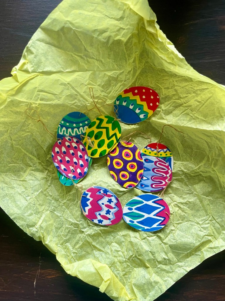 Först ut har vi de hemgjorda stackarna. En girlang jag pysslade ihop för flera år sedan, till jul egentligen, men helt klart påskigare i sina färger så den har fått flytta till påsklådan.