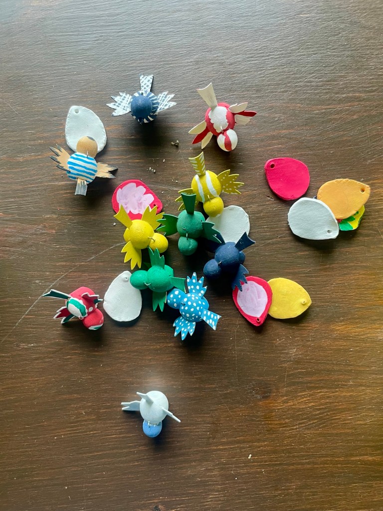 Ett år hittade jag omålade fåglar på loppis som jag började måla och samma år försökte jag mig på att göra platta ägg i självtorkande lera. Båda projekten övergavs och efter att detta foto tagits bestämde jag mig för att ge upp äggidén helt och slänga dem. Fåglarna gör jag förhoppningsvis klart, nån gång.