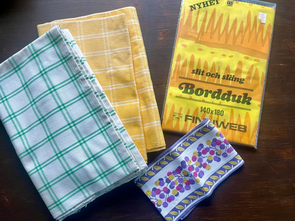 På textilfronten är det också snålt. Pappersduken av Lena Rewell hittade jag i år på Röda korset i Ektorp. Vi åker upp till huset i år och ska ha gäster på påskafton, varav en gäst är en bäbis, så jag tänkte att det blir perfekt med en pappersduk då. Den lilla löparen har hängt med i flera år och får nog pryda godisbordet. De rutiga hittade jag i mina textilgömmor och tänkte att det kan inte skada att ha extradukar till påsk, så de får också flytta med till huset. Någonstans ska jag ha en gul påskduk med påskkärringar på, och om den inte redan är i huset blir jag olycklig, för den var varken i påsklådan eller linneskåpet. Skandal, hur kan en vara så slarvig med sina högtidsdukar!