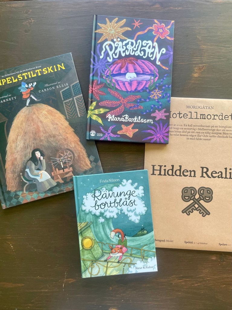 I förra veckan var jag och min kollega Carin på Pocketshop och pratade om japansk litteratur, men innan eventet började gick vi in på Söderbokhandeln för att spendera julpresentkort från jobbet. Det gjorde i alla fall jag utan problem, jag köpte tre barnböcker jag varit sugen på länge. Fler böcker finns dessutom medpackade och i bildörren ligger The Murder of Mr Wichham som jag just började läsa, den lovar gott. Således tänker jag läsa under påskhelgen. Massor. På Pocketshop köpte jag ett Hidden Reality-spel som förmodligen åker fram när Freddes kompisar kommer på besök.