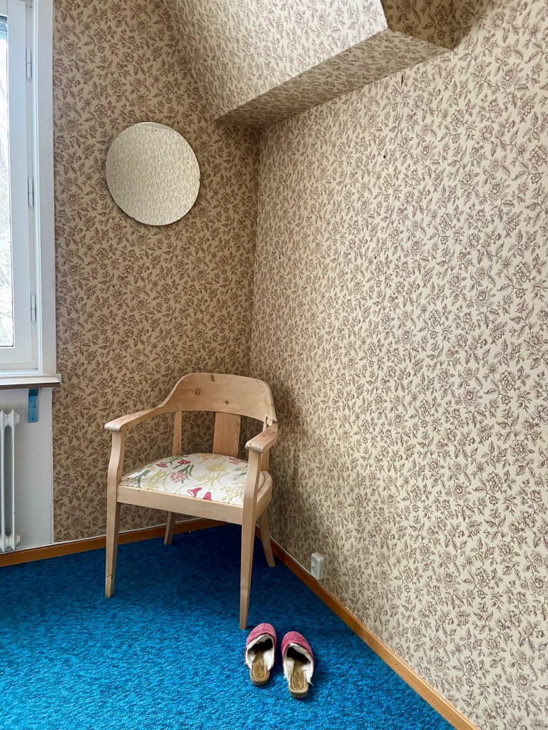 Det här hörnet är i vårt nuvarande sovrum. Det är mysigt och så, men lite daterat. Tapeten kan få sitta kvar, men den blå heltäckningsmattan måste försvinna, trots att min mormor hade samma i ett av sina smårum. Planen är dock byta sovrum, till ett av de omoderniserade, som inte fått isolering eller ordentlig el. Men det får dröja. När det väl händer har vi dock redan tapeter köpta och färgschema fixat.