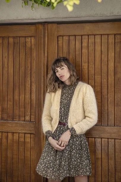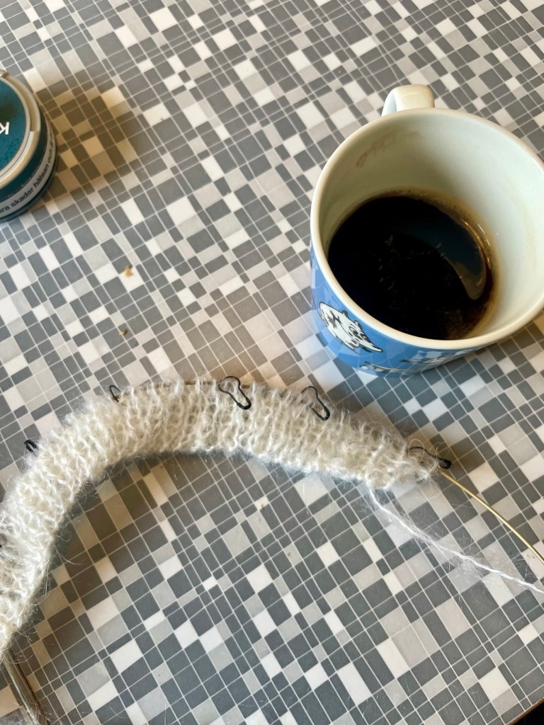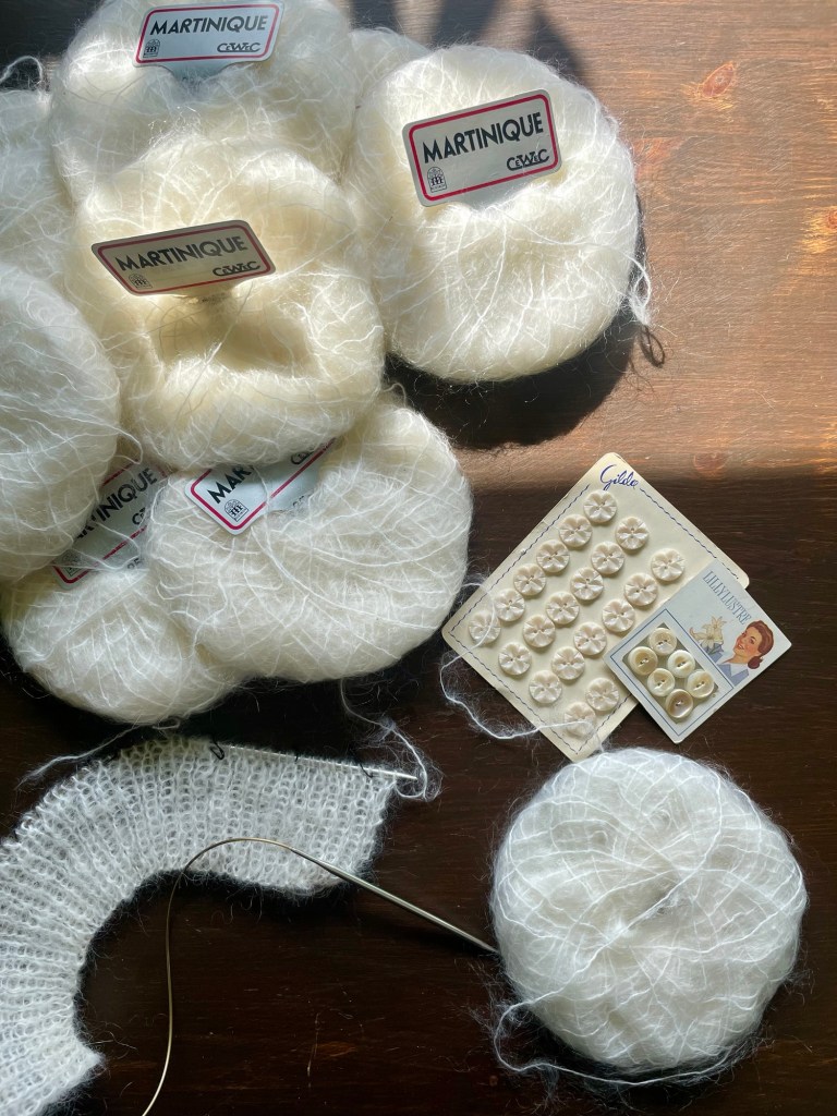 Jag läste på banderollen och började redan leta igenom hela Ravelry i jakt på ett bra koftmönster. När jag sydde den silvriga lurexklänningen till nyår kände jag att vad fint det vore med en mohairkofta till, som ett moln. Till slut hittade jag i alla fall Charlottes koftmönster och slog till! Om allt går som det ska borde nystanen räcka precis till denna kofta.