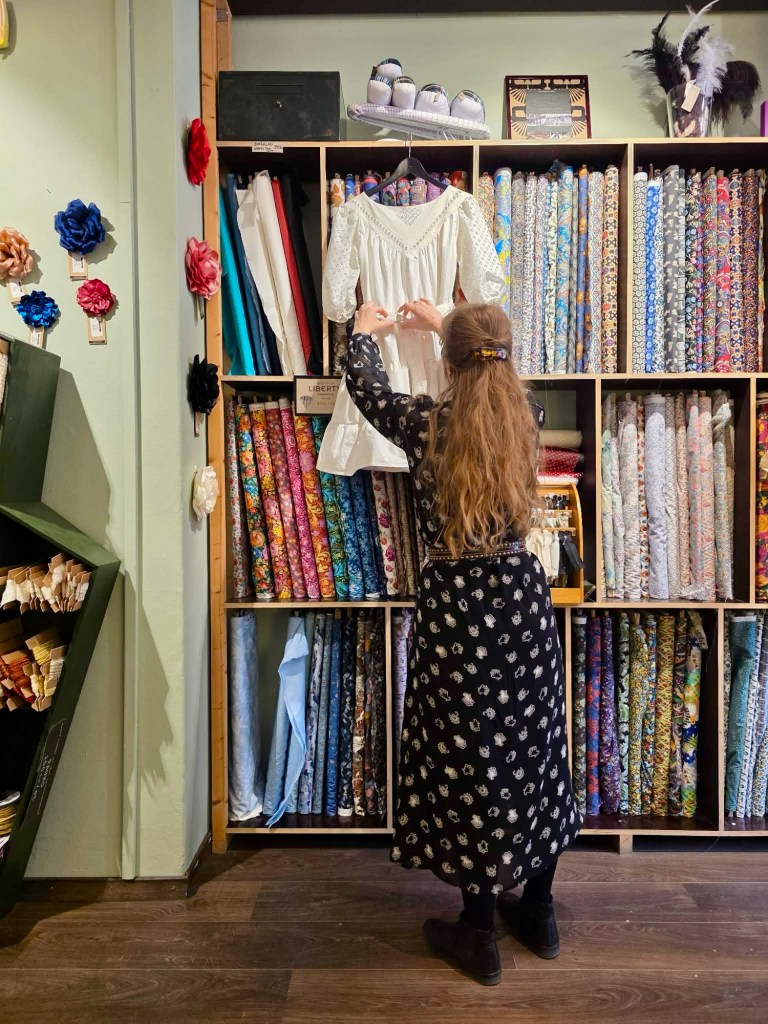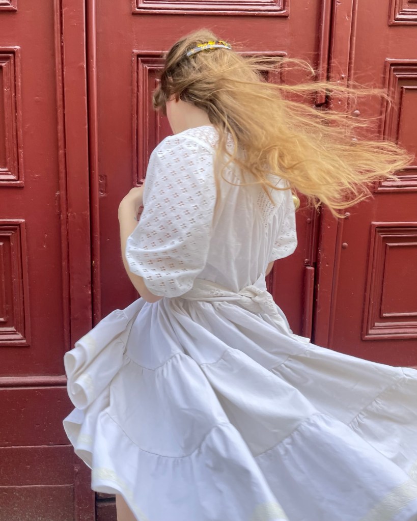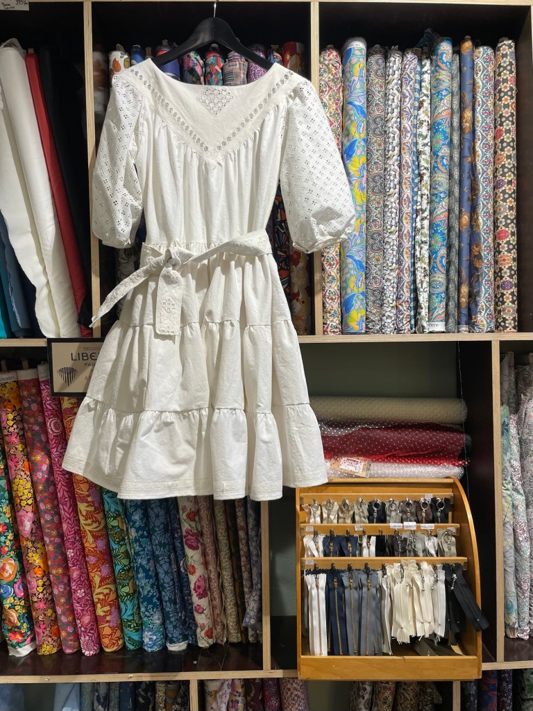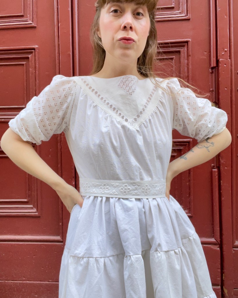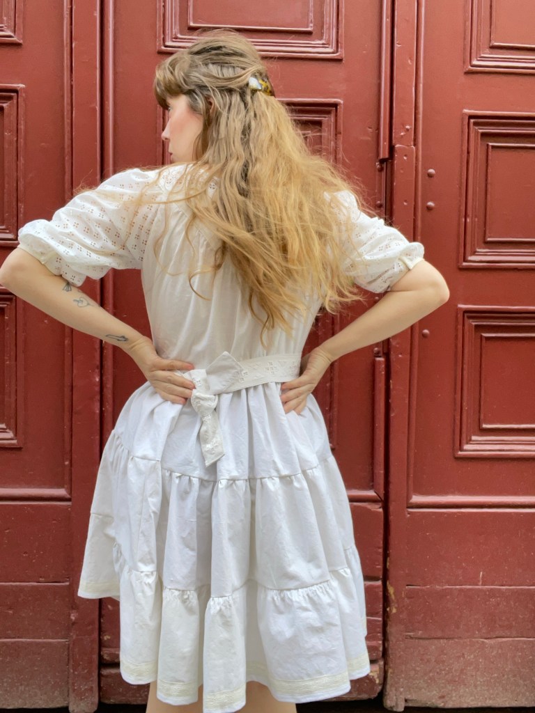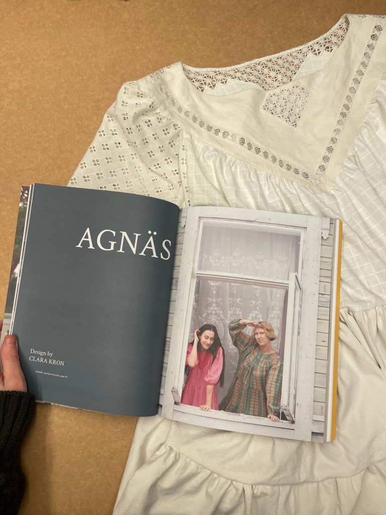 Klänningen är vådad och kjolen får massor av vidd, men en kan välja längden själv baserat på hur många våder en syr dit. Mönstret kommer även med två ärmlängder, här har jag valt den kortare längden. I detta fall sydde jag den genomgående av vintagetextilier, oket är en gammal duk, ärmarna en stuvbit, kjolen är ett gammalt lakan, och så vidare.