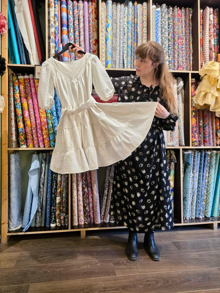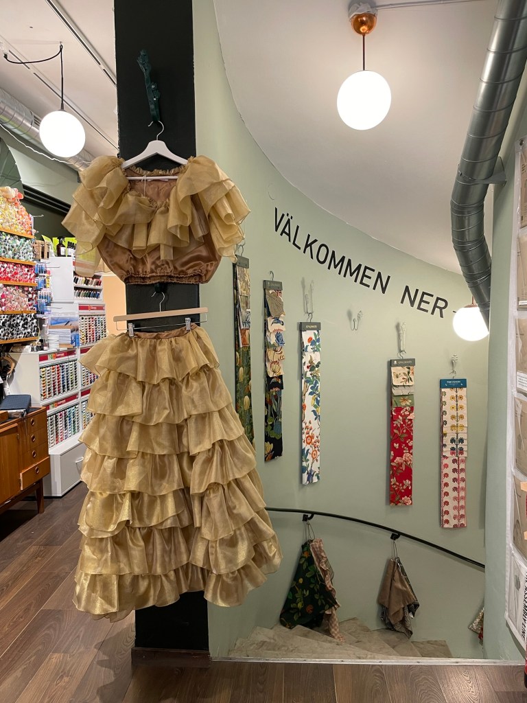 Inne i butiken hängde min vita variant av klänningen, och Stinas guldiga kjol och topp!