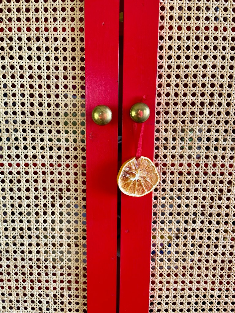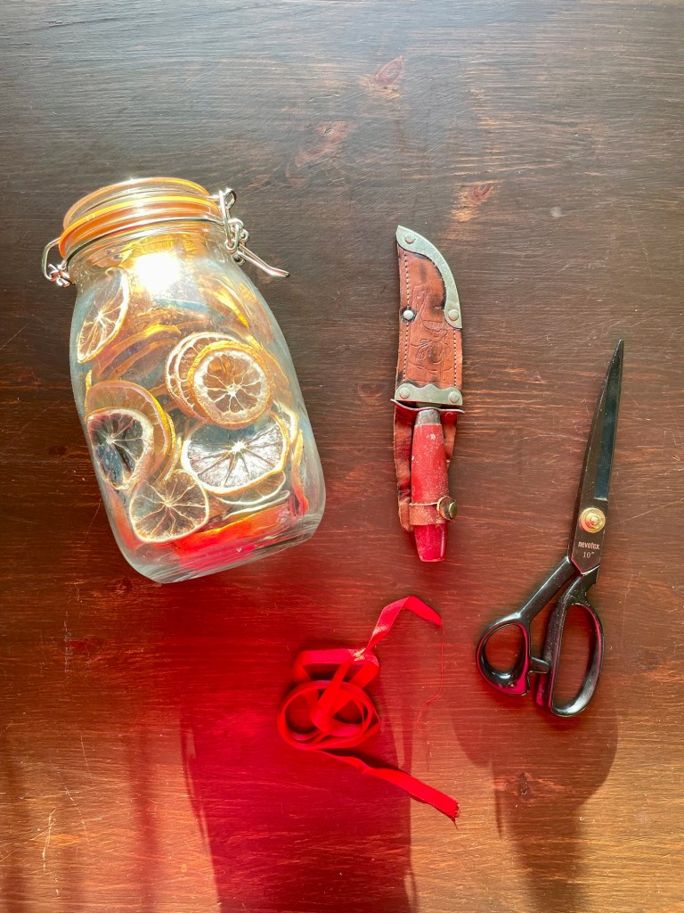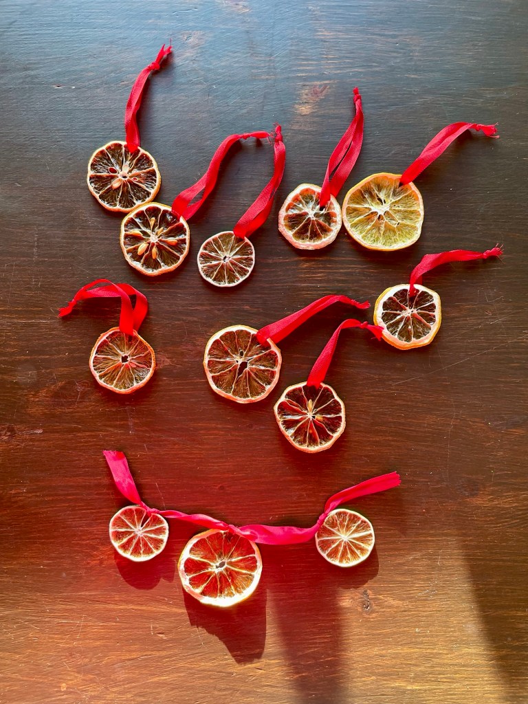 Jag hade ett gammal rött band liggande som jag klippte i lagom stora bitar, och valde sedan ut tillräckligt många citrushjul.