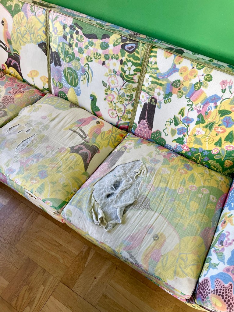 Redan när vi tog över den var den sliten, och hade rejäla vattenskador på tyget. Då sprättade jag av kuddtygerna, tvättade i maskin och satte tillbaka. Ryggen fick istället en bikarbonatstvätt och sedan var den fin igen. Det var nu tre år sedan, och kuddarna, som även för tre år sedan var i värst skick, är numera i ett bedrövligt stadie.