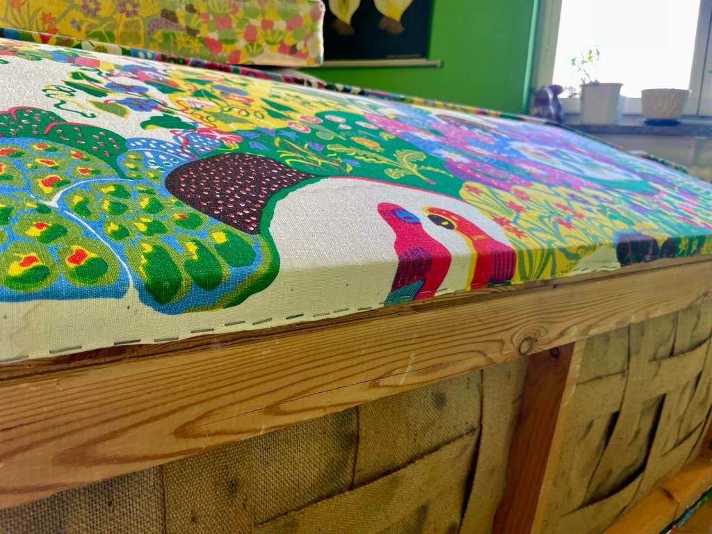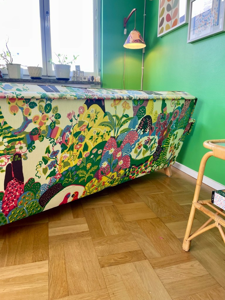 Det blev såklart inte perfekt, med bubblor i sargen och så vidare, men jag är ju ingen riktig tapetserare, så det var hit ork och kunskap tog mig, inte längre. Men det gör heller ingenting. Soffan är hel, mycket färggladare och kommer leva ytterligare många år.