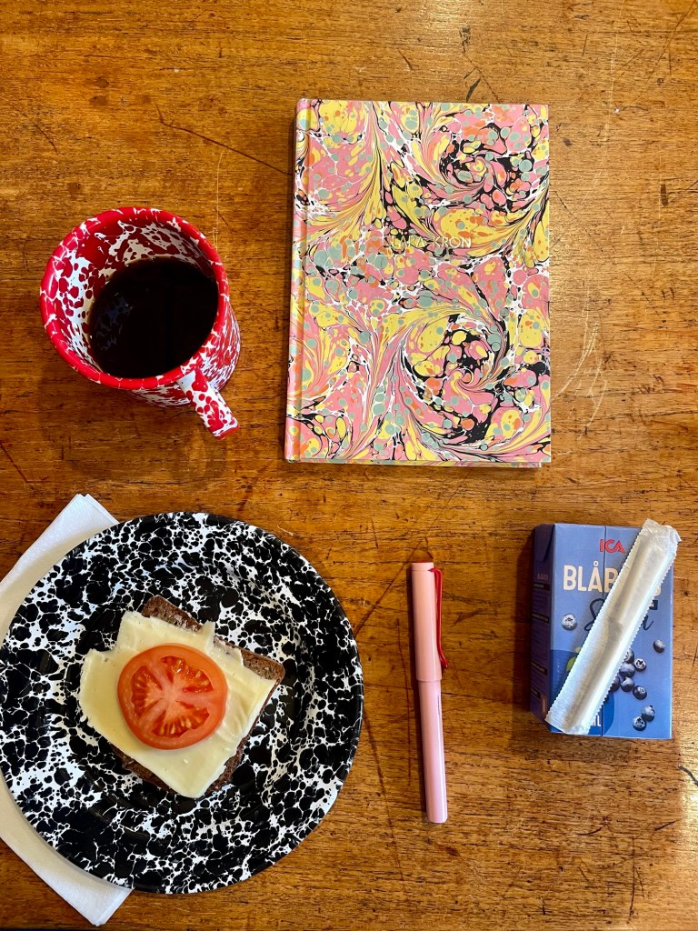 I torsdags och fredags hade jag skola. Jag går Skeppsholmens folkhögskolas kurs Skriv! och vi ses ungefär en gång var sjätte vecka. Kursen är toppen och en får frukostfika. Eftersom jag hade hittat ett matchande emaljfat till min kopp så tog jag med den. För vissa i hushållet ifrågasatte nödvändigheten i sagda fat, så jag behövde ju visa att det kom till användning.