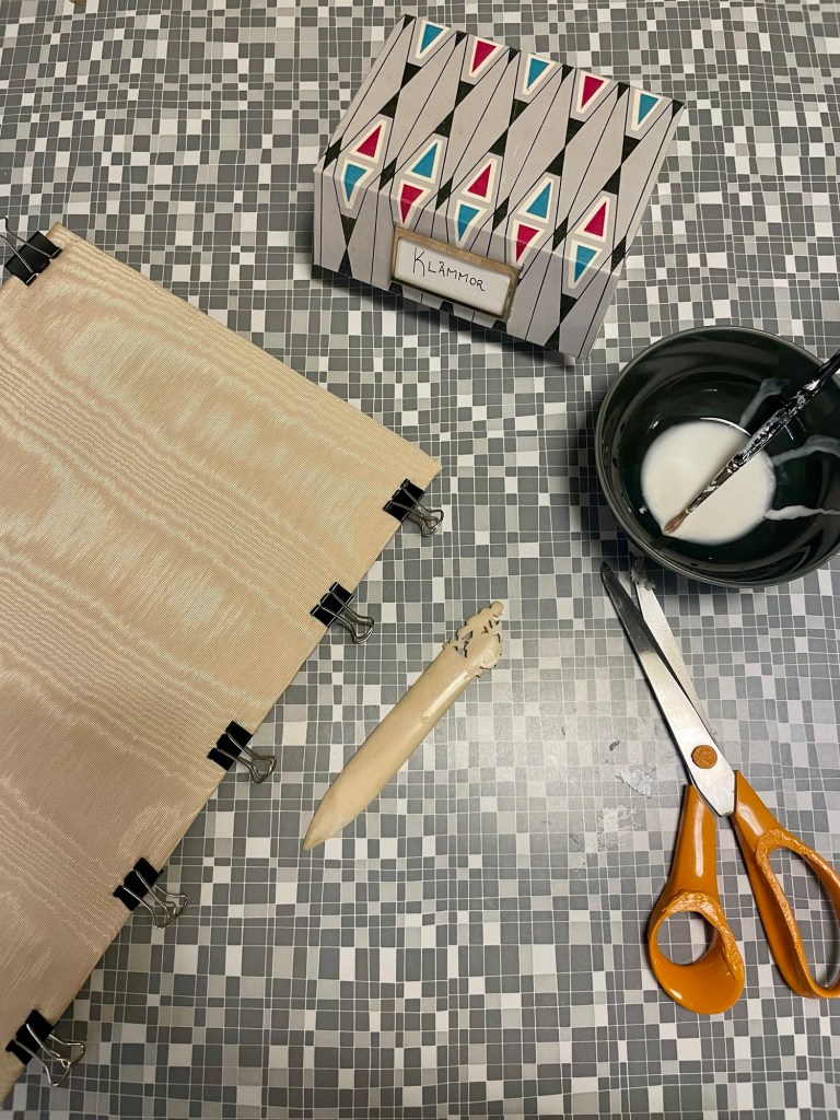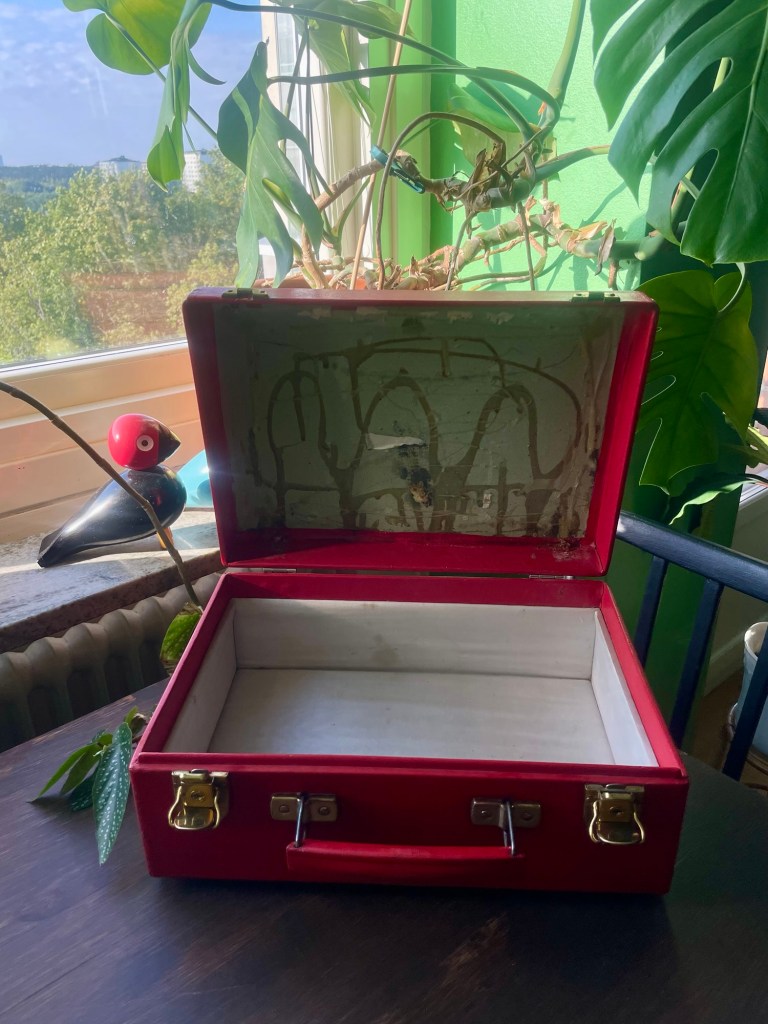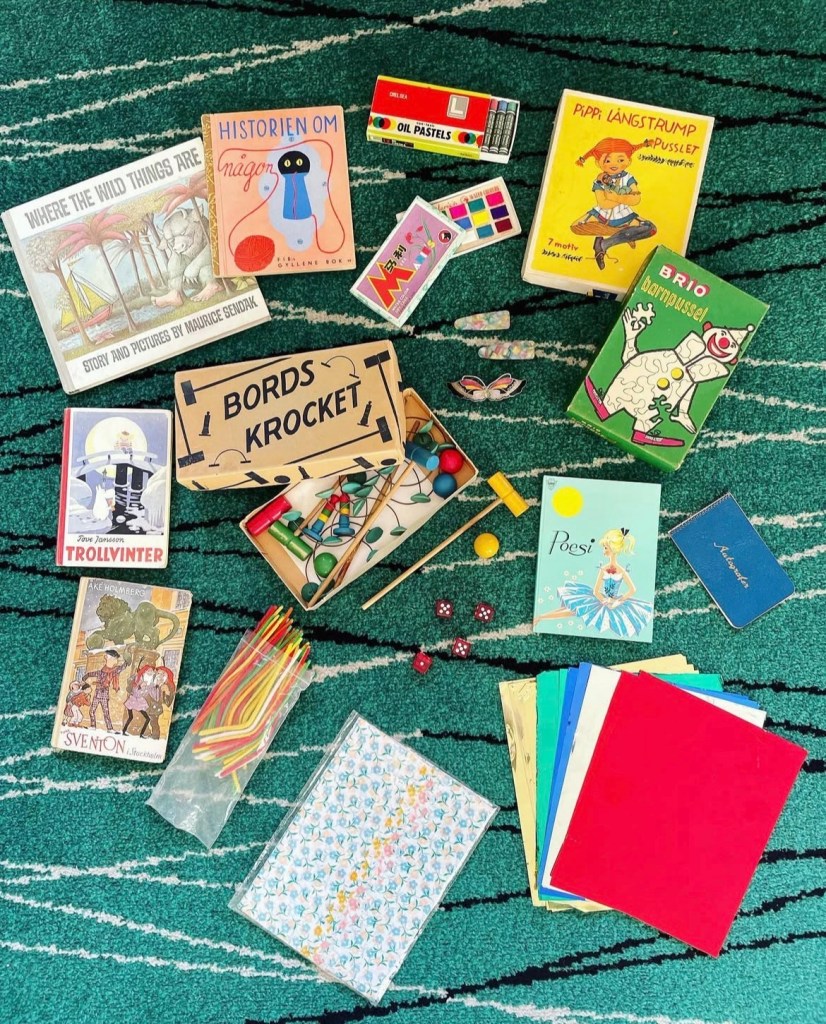 ✨ Pysselmaterial. Börjar man tänka på det ser man det överallt. Kritor, vattenfärger, roliga papper, piprensare, pennor, pärlor, lim, tejp, och mönsterklippande saxar. Förslagsvis köpes en verktygslåda (även den på loppis) och fyller den med allt som behövs för att riktigt stöka ner. Rosett runt handtaget så är det klart!
