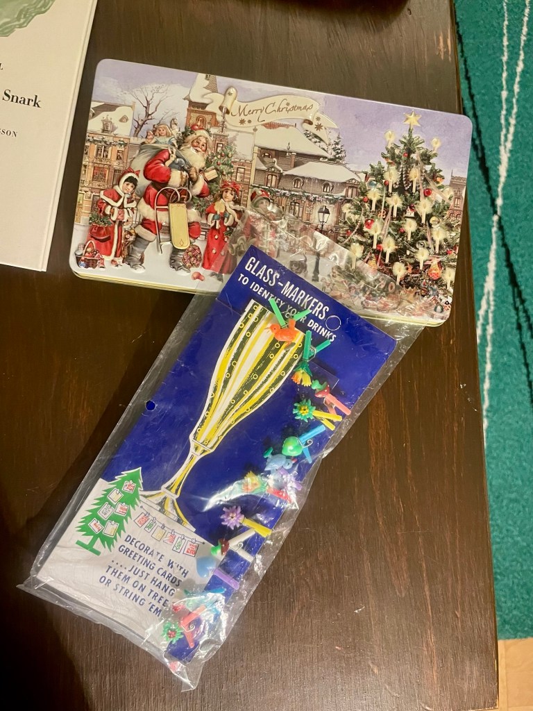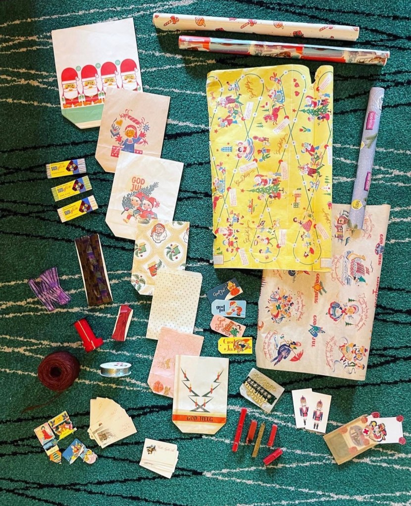 Sist ut i denna serie är självklart inslagningen. Även allt sådant köper jag begagnat. Men det gäller att vara uppmärksam året om, ibland kommer omslagspapprens fram först vid jul, andra gånger ligger de förklädda i en hink med affischer mitt i sommaren. Det enda problemet, i alla fall för mig, är att jag ofta tycker att sakerna är för fina för att använda. Men jag gör mitt bästa för att bli generösare även när det kommer till förbrukningsvarorna.