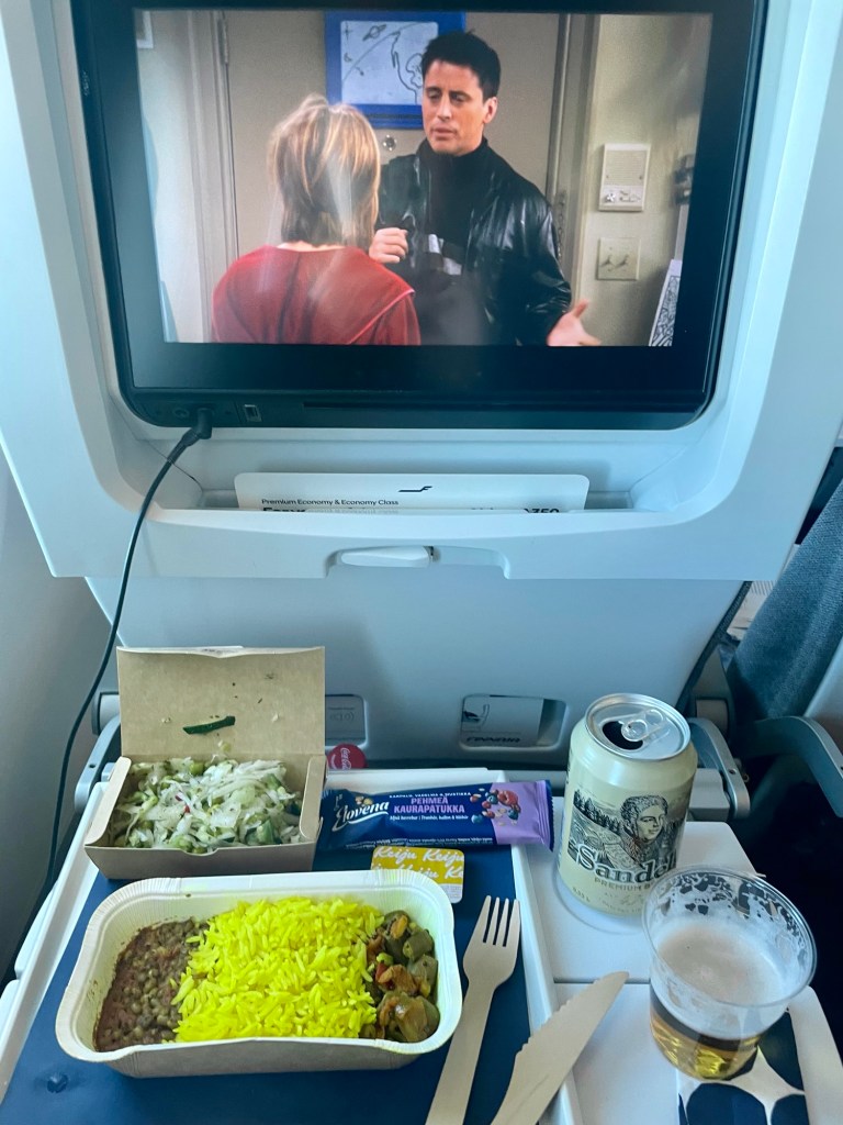 Hoppade på ett nytt flyg, serverades middag, öl och underhållning.