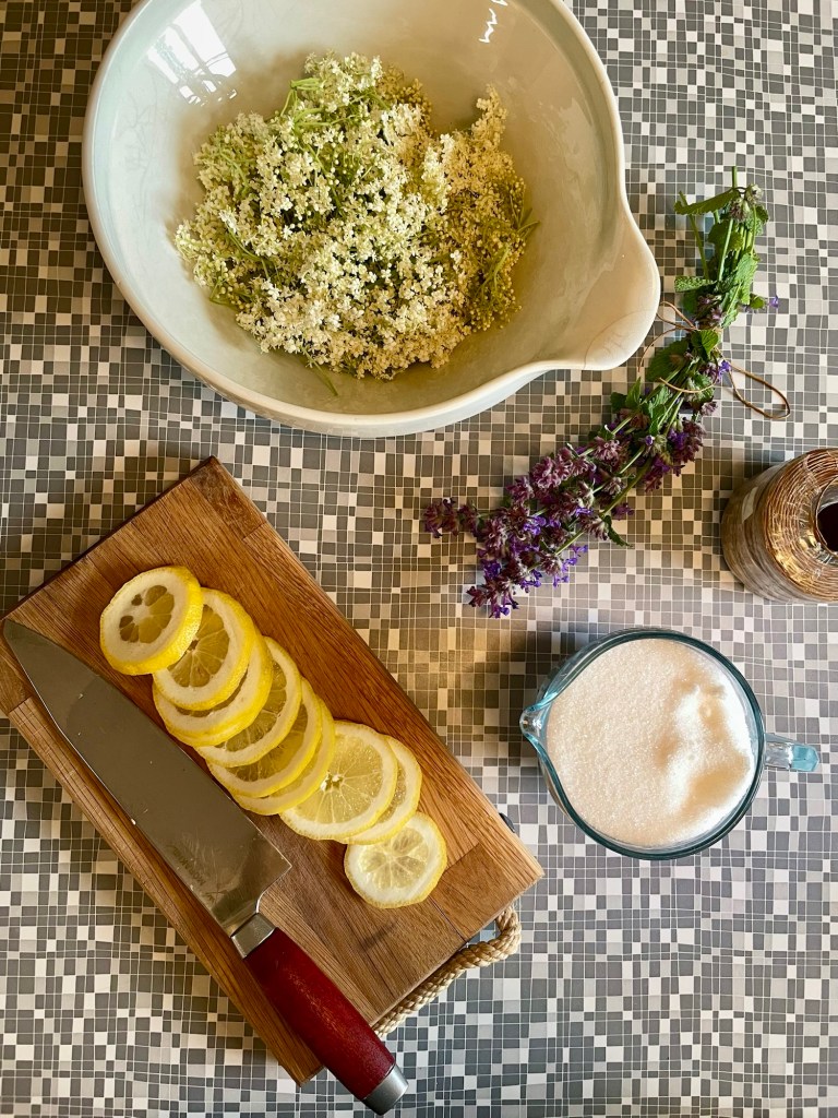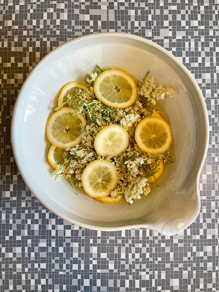 Jag varvade fläder och citron och hällde över vatten och socker som fått koka upp. Sedan fick de vila i kylen på obestämd tid.
