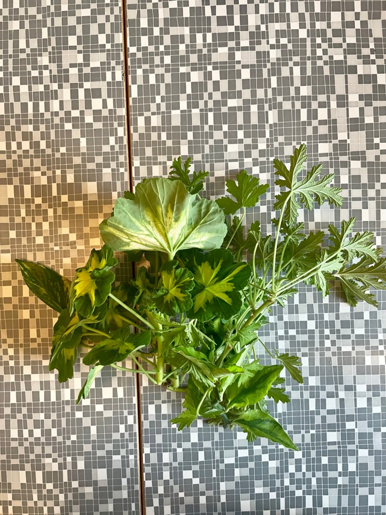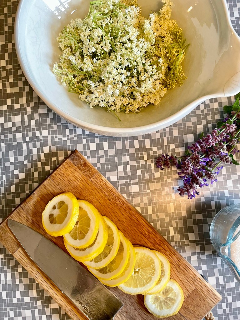 Fläderklasar plockades bort från grövre stammar och citron skivades tunt. Strax utanför huset hittade jag något som skulle kunna vara lavendel också, men den luktar inte helt rätt.