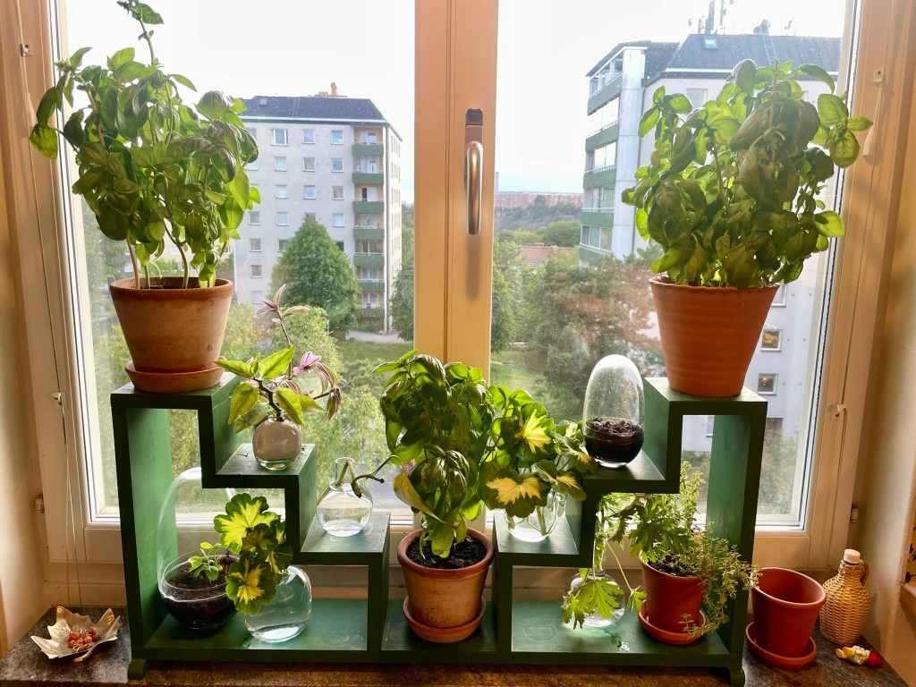 Så sticklingar på allt möjligt togs och sattes i vatten för att rotas, citronfröet jag planterade för någon månad sedan fick större växthus, hallon planterades i det mindre osv osv. Fredrik var på spelning denna måndag och när han kom hem var det jord över allt, saftklibbigt köksgolv, allmänt stökigt och stora påsar tvätt för honom att vika i hallen. Snällt välkomnande 🙂 Men också herregud vilken härjig måndag , Clara. Lugna ner dig.