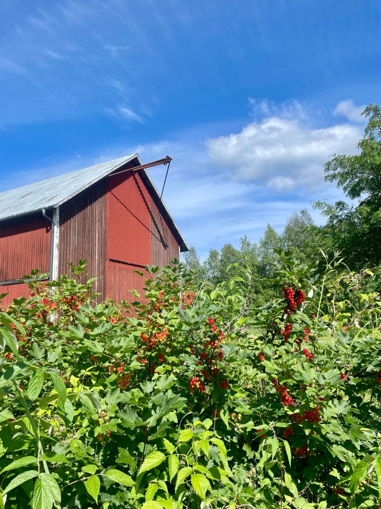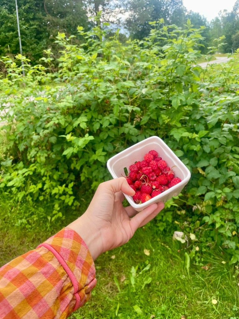 Igår vaknade jag tidigt, och solen sken, men det skulle bli regn. Jag skyndade ut i trädgården i pyjamas. Jag ville ha hotellig frukost och plockade hallon och jordgubbar.