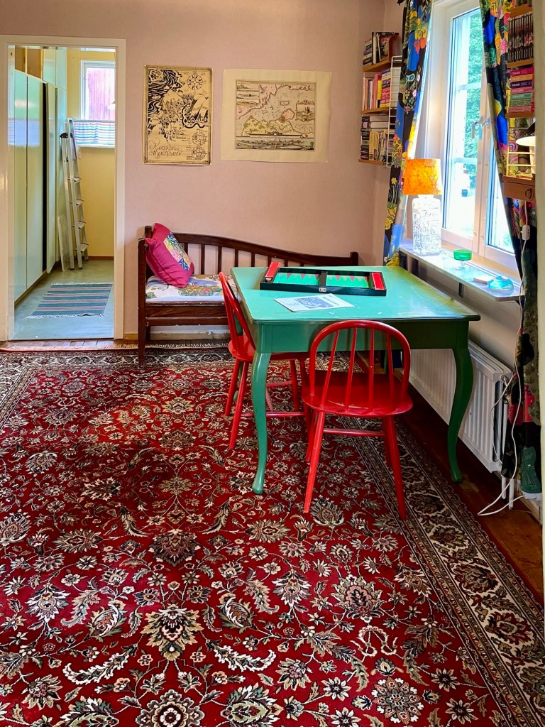 Sedan ringde våra grannar Ulf och Leif och undrade ifall vi ville ha en stor matta. Det ville vi gärna! Den pryder nu nästan hela biblioteksgolvet, i alla fall tills den dagen vi bestämmer oss för att fernissa om.