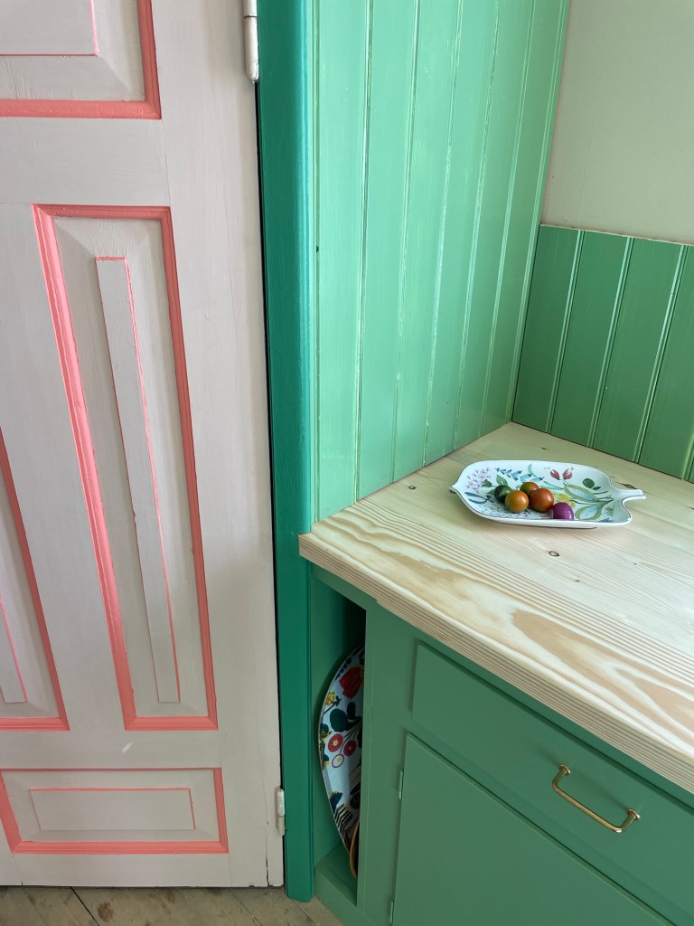 Och fodret då? Jo, jag bröt om färgen både en och två gånger och målade om. Det syns väldigt lite skillnad på skärm, men i verkligheten blev det mycket behagligare tillsammans med sponten.