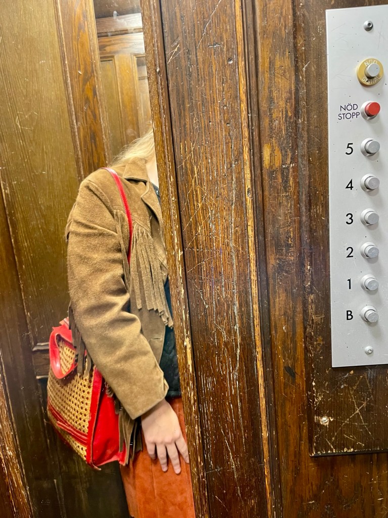 Jag hade mocka på mig från topp till tå och som alltid i deras hiss tänkte jag på Maria Gripes Tre trappor upp med hiss.